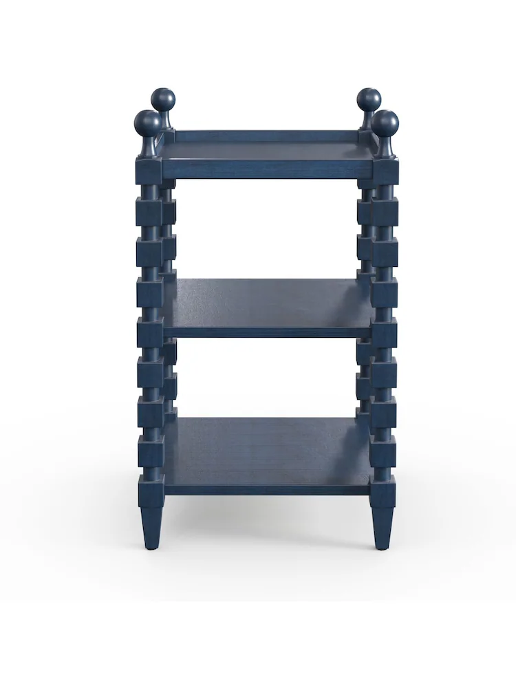 This fun statement side table offers a fresh perspective on classic bobbin furniture. The finials on top honor the circular shapes of the original, while the legs showcase blocks for a daring reinterpretation. When considering the dimensions of the square forms, our designer found inspiration stacking her son’s building blocks – the distinctive piece now carries the name Huxley. The selected hardwood frame is hand finished in a rich blue color and then rubbed for a tonal effect that uncovers its depth, resulting in a finish far from flat.